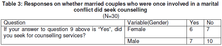 Table 3 above shows that 46% of the female respondents who were involved in marital conflicts sought for marriage counselling against the higher percentage of 54% who did not. The table also shows that a lower percentage of 41% male respondents sought for marriage counselling against a higher percentage of 59% who did not. Findings from the interviews with the four informants revealed that professional counselling is not yet fully fledged, unlike in countries like Botswana, South Africa and Kenya. The Pastor noted that married couples do not seek counselling because, some Pastors are in the habit of taking the counselling issues that are brought to them to the podium as they preach, which tends to embarrass the married couples. The Victim Friendly Unit Coordinator was of the view that married couples do not seek counselling because, they are economically dependent on men, and they do not come with their problems to the police because they think that their spouses will be arrested and jailed. The Chief was of the view that the round table way of resolving marital conflicts is almost dead because relatives are no longer as active as they used to be in the past in handling marital conflicts.