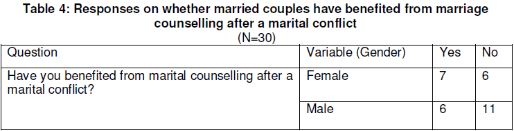 Table 4 shows that 54% of female respondents claimed that they had benefited from marital counselling after a marital conflict. On the other hand, only 35% of their male counterparts admitted that they have benefited from marriage counselling after marital conflicts. However, the Senior Lecturer was of the view that counselling is quite beneficial, particularly if Professional Counsellors stick to their ethical obligations. The Pastor was also of the same view, also arguing that counselling, combined with prayers is quite beneficial to those involved in marital conflicts. The Chief said that if the round table way of resolving marital conflicts is implemented well, wherein members from both families of the spouses are called together to help married couples, marital conflicts can be resolved amicably. The Victim Friendly Unit Coordinator was also of the view that counselling married couples at the Police Station may not be as beneficial as some spouses may not open up.