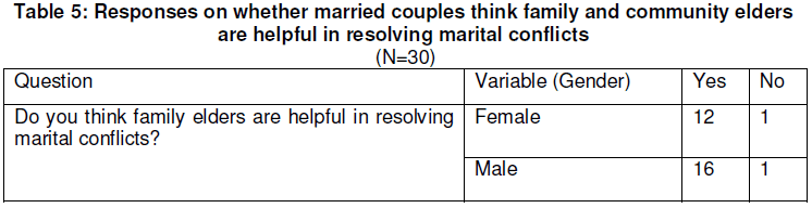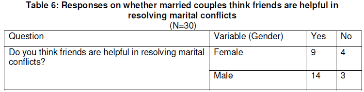 Table 6 shows that 69% of female respondents believed that family friends are helpful in resolving marital conflicts, whereas, as many as 82% of male respondents are also of the same view. It would appear that men unlike women are more comfortable with the marital help from friends. Interviews carried out from the key informants revealed that friends are not really helpful, as some may also be behind the marital conflicts.
