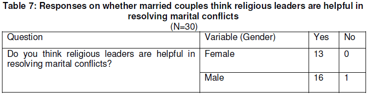 Table 7 above shows that all (100%) female and 94% of male respondents think that religious leaders are quite helpful in resolving marital conflicts. Findings from interviews carried out from the key informants showed that all the respondents agreed with the notion that religious leaders are helpful in resolving conflicts. Married couples are not only assisted psychologically, but they are also empowered spiritually. However, some married couples expressed concern over the behaviour of some Pastors who are in the habit of taking their issues to the podium during preaching. Confidentiality is not assured, and as such, some were of the view that this may scare away individuals in need of marital counselling.