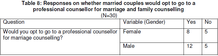 Table 8 above shows that 62% of female and 71% of the male respondents would opt to go for professional marriage counselling. Findings from the interviews with the four informants suggests that even though professional counselling is not yet fully fledged in Zimbabwe, given an opportunity, Zimbabweans will go for professional counselling (Senior Lecturer). From the Senior Lecturer’s perspective, this is because people believe that Professional Counsellors are trained. However, some married couples indicated that they were not comfortable to discuss their issues with strangers. This clearly shows a lack of knowledge about professional counselling among some married couples.
