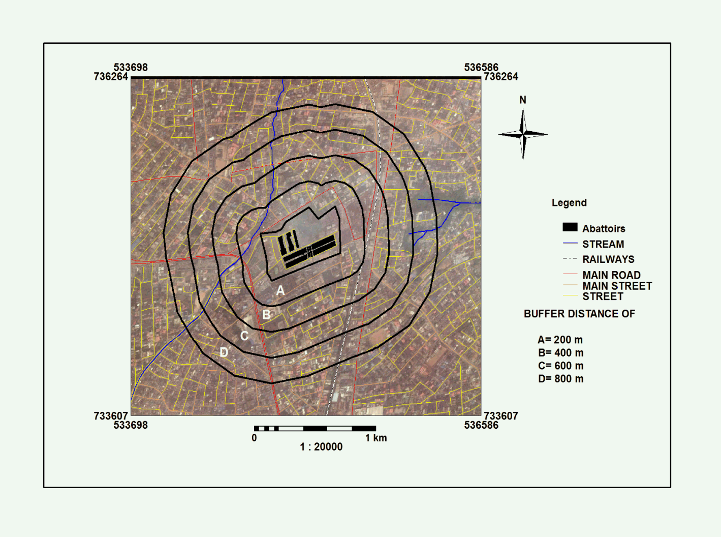 For the purpose of this research, the study area was stratified into four (4) different strata. Using ArcView 3.2, the image of the area was carved out from Google Earth Map and imported to GIS environment. This was further processed for digitisation and stratification to different strata as required by the study (Figure 1). The first stratum comprised the areas below 200m to the abattoir, the second were areas within 200m – 400m from the abattoir, the third stratum consisted of areas within 400m – 600m and the fourth were areas within 600m – 800m from the abattoir.