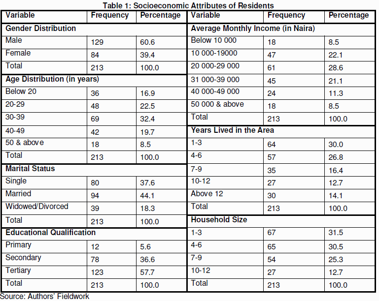 The study revealed, as shown in Table 1, that male residents accounted for 60.6% of the total, 91.5% of the residents were aged 50 years and below while 62.4% of them were married have been married before the survey. Further enquiries into the socioeconomic attributes of the residents showed that some of them had secondary education (36.6%) and 57.7 had tertiary education. All these socioeconomic attributes indicated that the residents were capable of giving reliable information on the subject of study.
