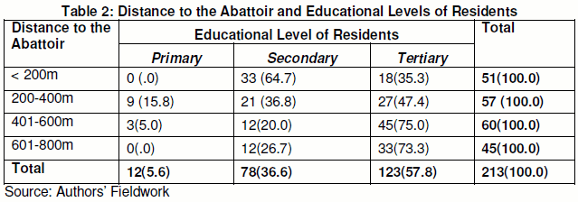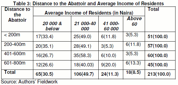 Specifically, two socioeconomic variables (level of education and income) were examined based on the varying distance of residences to the abattoir. This is because these two variables largely determine the choice of residence of an individual. As presented in Table 2, the focus is on row percentage in order to know specifically the percentages of the residents according to their level of education across the strata. It is discovered that as distance increases from the abattoir there is increase in the educational level of the residents. For instance, it is shown that out of 51 respondents within less than 200 metres to the abattoir, 35.3% had tertiary education, it increased to 47.4% in the second stratum with another increase to 75% in the third and fourth strata. The Chi-square results in this respect (χ=44.655, ρ=0.000) indicate that there is significant relationship between educational levels of the respondents and the distance of their residences to the abattoir. In the same vein, for average monthly income of the residents, it is shown in Table 3 that variation existed in the income of residents across the strata. The Chi-square results (χ=24.244, ρ=0.019) indicate that there is significant relationship between educational levels of the respondents and the distance of their residences to the abattoir.
