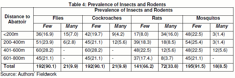 Findings on the environmental effects of the abattoir revealed that variation also existed across the strata. From the literature, an environmental effect of abattoir on the surrounding residences is the prevalence of insects and rodents. As shown in Table 4, the prevalence flies, cockroaches, mosquitos and rats was considered for this study. The prevalence was dichotomised into ‘few’ and ‘many’ in each case based on distance segmentation. It was discovered that there was a decrease in the rate of prevalence with increase in the distance of the abattoir to the residence of the people. This is further established by the Chi-square results (flies: χ=98.330, ρ=0.000; cockroaches: χ=30.960, ρ=0.000; mosquitos: χ=70.488, ρ=0.000; and rats: χ=27.855, ρ=0.001) establishing that there is a significant relationship between levels of prevalence and distance from the residences to the abattoir.
