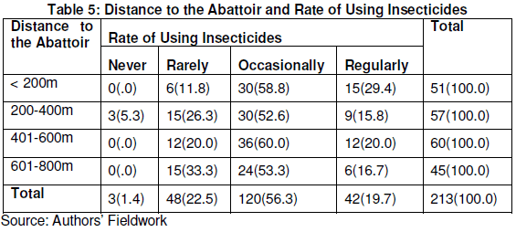 In complement of the findings on prevalence of insects and rodents in the abattoir, are findings on rates of insecticides usage by respondents across the strata in the study area (Table 5). It was discovered that the need to use insecticides by the residents increases with nearness or reduction in the distance of their residences to the abattoir. This is because significant proportion of the residents living close to the abattoir occasionally and regularly used insecticide while those living farther rarely used insecticides. Results of Chi-square test results (χ=24.455, ρ=0.018) show that there is a significant relationship between distance of residence to the abattoir and rate of insecticides usage.