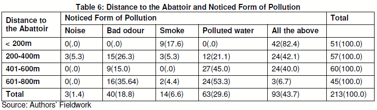 Findings on the noticed form of pollution across the strata revealed that almost all the residents within 200 metres (82.4%) to the abattoir experienced noise, bad odour, smoke and water pollution as a result of the operations of the abattoir (see Table 6). The level of this experience also reduced with increase in distance to the abattoir. This is further confirmed by Chi-square test results (χ=141.451, ρ=0.000) indicating that there is a significant difference in the polluting effects of the abattoir across the defined strata in the study area.