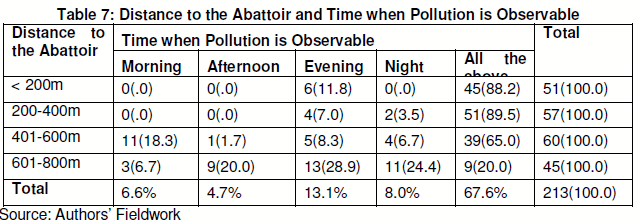 In the same vein is the time when pollution is observed in the area as contained in Table 7. For the residents residing within the distance of less than 200 metres and those within 201 metres to 400 metres, it was discovered that 88.2% and 89.5% of them experienced pollution all the time. However, with increase in distance to the abattoir, the time varies with the residents either experiencing pollution in the morning, afternoon, evening or night. The Chi-square test results (χ=117.600, ρ=0.000) supports this and that indicates that with varying distance of residences to the abattoir, there was variation in the time that the residents experienced pollution.