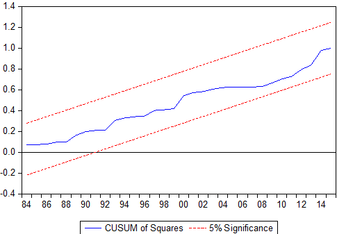 The result of the diagnostic tests is presented in table 5 below. We conducted the Linearity test (using Ramsey Reset Test), Serial Correlation test (using Breusch-Godfrey Serial Correlation LM Test), Heteroscedasticity test (using Breusch-Pegan-Godfrey Test), Normality test (using Jarque-Bera Statistics) and Stability test (using CUSUM & CUSMSQ test). The study reveals that the model passes the diagnostic tests against serial correlation, functional form misspecification, heterosckedasticity and non-normal errors as presented in Table 6 below. Also, the model passes the stability test using the Cumulative Sum of Square (CUSUMSQ) that there is stability in the coefficients over the sample period as shown in figure 1 below. This is so because the plots of the CUSUMSQ remained within the critical 5 percent limit.