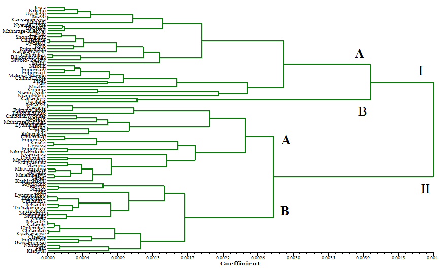 For a better understanding of the genetic relationship among common bean genotypes, the genetic similarity (GS) values were submitted to hierarchical clustering by UPGMA. The dendrogram based on Nei’s coefficient of genetic distance suggested the existence of two clusters with sub clusters (Figure 1). The Cluster I was further subdivided into two sub clusters of A and B in total comprised of 31 and 2 genotypes of common bean respectively. Cluster II was also divided into two sub cluster designated as A and B with a total of 28 and 23 genotypes respectively (Table 4).