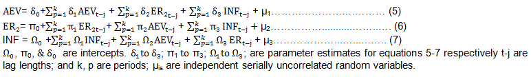 AEV = Agricultural export value. ER = Exchange rate. INF = Inflation rate. TO = Trade openness. INR = Interest rate. β0 = vector of the intercept. β1 = vector of the parameter of exchange rate. β2 = vector of the parameter of Inflation rate. β3 = vector of the parameter of Trade openness. β4 = vector of the parameter of interest rate. U = error term. t = time.