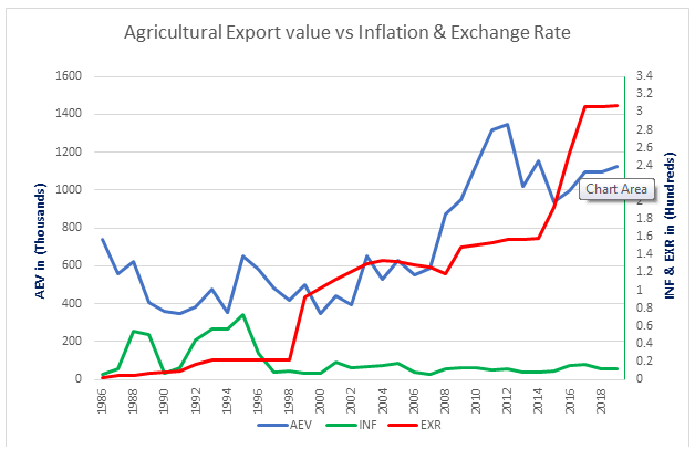 Figure 1. The Trend of Agricultural Export Values vs Trend of Inflation & Exchange Rate.