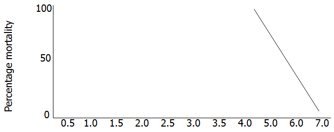 Fig 1: Lethality study (LD 50) of the effects of administering graded doses of (500-7,000mg per kg 1.p rat) Abelmoschus esculentus against the percentage mortality.