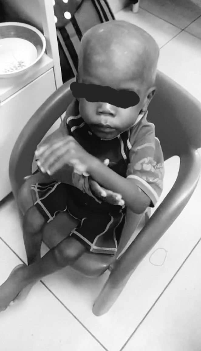 At presentation, he was moderately pale, had sparse brown fluffy hair, wasted with loss of subcutaneous fat and had bilateral pitting leg edema up to the knees. His weight and length were <-3SD on the WHO z- score (7kg and 69cm respectively). His mid upper arm circumference (MUAC) was also low at 10.5cm. He was conscious and apathetic and had continuous trembling of both hands (left more than right) with nodding of the head. Tremors were worse when he attempted voluntary movements like feeding, raising the hands or reaching out to take an object and reduced or disappeared during rest or sleep respectively. Sometimes the tremors were so severe that he had to use one limb to support the other in an attempt to control them. His tone was reduced in all limbs and deep tendon reflexes were not exaggerated. Respiratory rate was normal at 30cpm and breath sounds were vesicular. His abdomen was distended but no organs were palpable. His heart rate was 107bpm and heart sounds 1 and 2 only were heard.