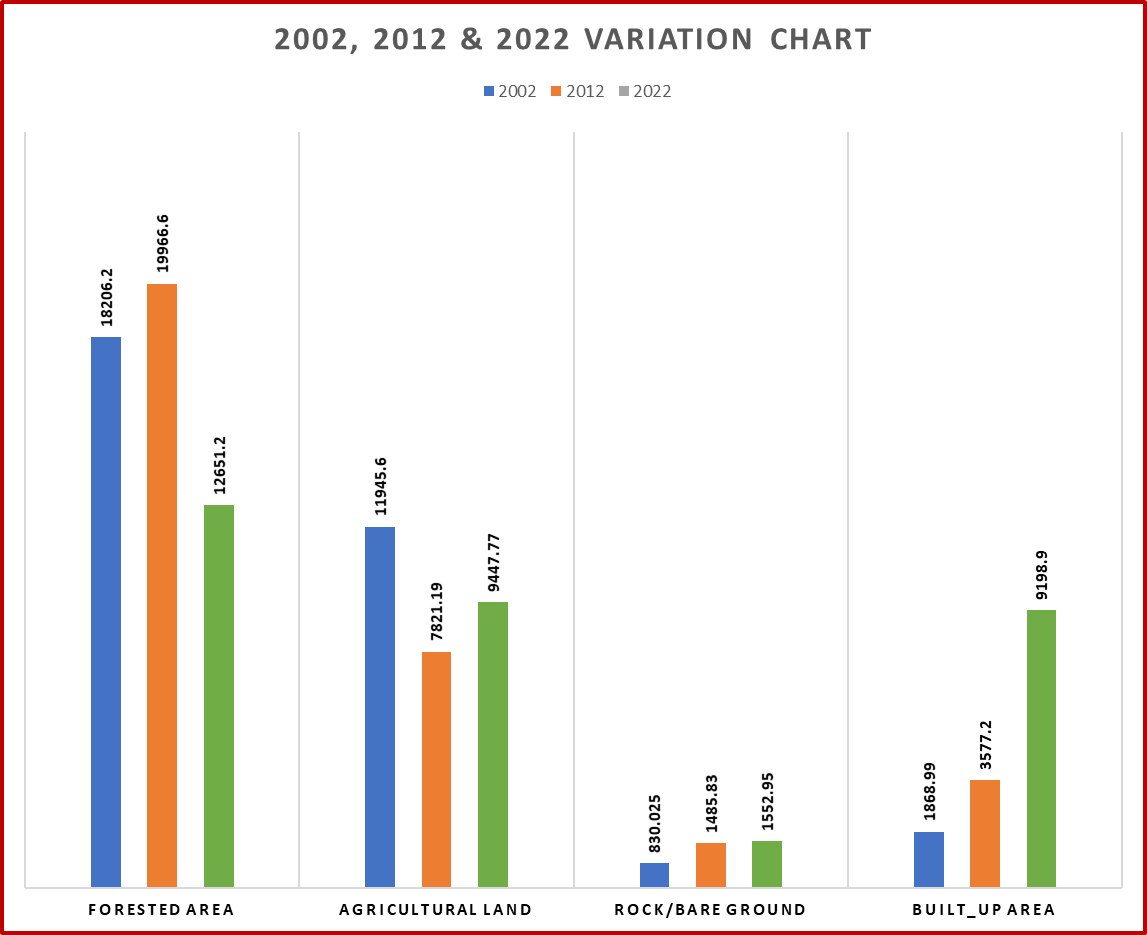 The comparative analysis between 2002 and 2022 showed a decrease in agricultural land and a substantial increase in built-up areas. This transformation can be attributed to the effects of urbanization, including land conversion for settlement and recreational purposes. Furthermore, the study revealed that the area covered by forests decreased rapidly from 2012 to 2022, indicating a loss of valuable natural resources.