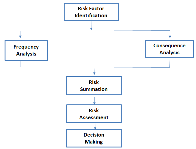(e). Risk Assessment: To identify if the risk is tolerable/intolerable and to identify risk reduction or mitigation measures and prioritize these using techniques such as risk ranking and cost-benefit analysis. These elements are shown in the flow in Figure-1 below. The elements of the procedure are used both to generate information and as an aid to decision making in managing the risk.