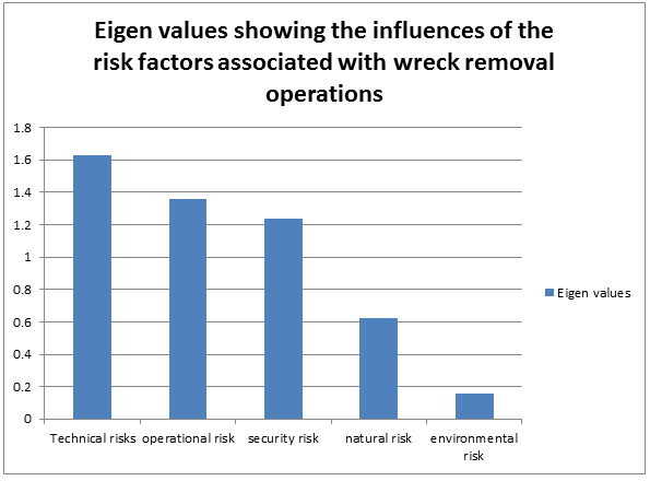 Similarly, technical risks, security risks and operational risk each with Eigen value greater than 1 (Eigen>1), significantly influence the success of shipwreck removal operation and as a result form the determinant risks/hazards associated with shipwreck removal operations in Nigeria’s waterways.