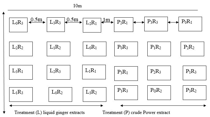 The experiment was laid out in Randomized Complete Block Design (RCBD), with 4 treatment levels replicated 3 times making it 24 experimental units (beds). The experimental site was manually cleared, path and seed bed were prepared before planting. The size of the experimental plot was 12m X 10m making it an area of 120m². The planting space was 90cm by 60cm, each bed was measured 3m X 1m and the distance between each bed was 0.5m by 0.5m.
