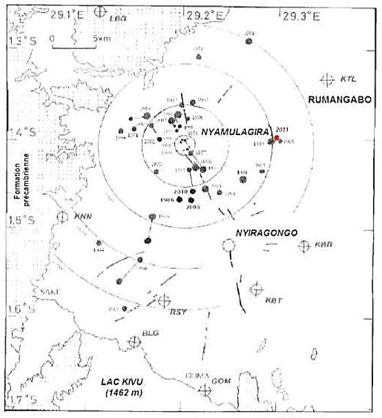 Figure 4b: depicts the distribution of the various cones associated with the eruptions of the volcano Nyamulagira from 1901 to 2011. (after Kasahara, 1991, modified).