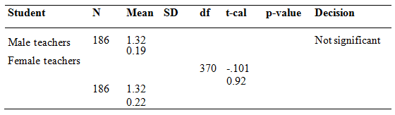 The t-test in Table 4 shows that there is no statistically significant difference in the mean ratings of teachers. This is shown by the t-cal value of -.101 and p-value of 0.92 which is more than alpha value 0.05 level of significance. Therefore, the null hypothesis of no significant difference was accepted.