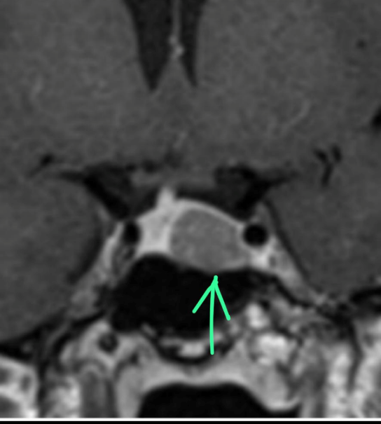 Figure 1. Coronal section, T1 weighted post-contrast dynamic sequence image of the pituitary fossa showing the tumour, a rounded region of delayed enhancement (green arrow) compared to the rest of the gland.