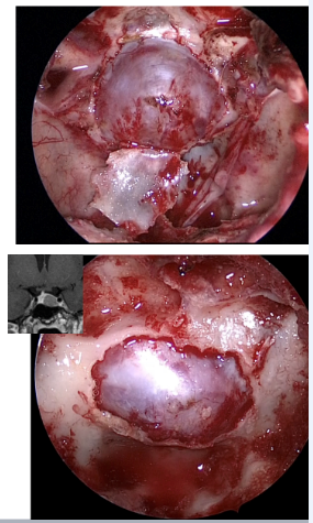 Figure 2. Standard endoscopic view of the sellar floor with the bone removed. Inset of the preop coronal MRI image.