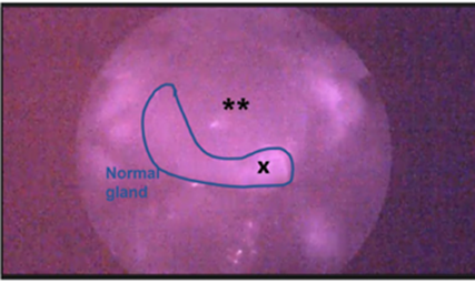 Figure 3. Custom endoscopic view after ICG administration showing the less fluorescent adenoma (marked **) and the normal gland pushed to right (marked x).