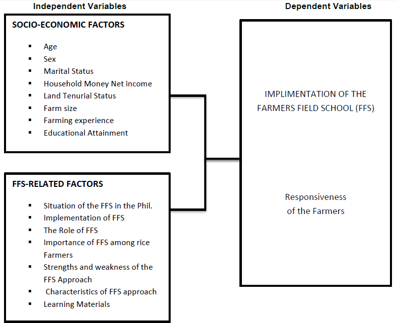 Figure 1 shows the conceptual framework which presents the variable of the study. The first set of variables includes socio-economic information of rice farmers such as age, sex, marital status, household monthly net income, land tenurial status, farms size, farming experience, and educational attainment. Another set of variable includes farmers field school related factors such as the situation of FFS in the Philippines, implementation of FFS, the role of FFS, importance of FFS among rice farmers, strength and weakness of the FFS Approach, characteristics of the FFS Approach and learning materials. The final variable explored in this study was the implementation of the farmers field school, particularly the responsiveness of the farmers.
