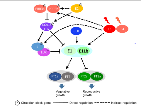 PRR3a and PRR3b bind to the promoters of GmLHYs/ GmCCA1s to repress their expression. The daily oscillation of GmLHYs/GmCCA1s transcript levels is opposite that of PRR3a and PRR3b under LD. GmLHYs/GmCCA1s bind to the promoter of E1 to inhibit its expression, and they also bind to the promoter of J to induce its expression. E3 and E4 induce E1 transcription, with peaks in the early morning and dusk in LD. Under SD, J (a component of the evening complex) binds to a LUX binding element in the E1 promoter to repress its expression. J transcript levels oscillate throughout the day with a peak at dusk in SD, but its function in LD remains unexplored. E1 protein levels during the day are still unclear, but E1 inhibits the peak expression of GmFT2a and GmFT5a in LD, likely by binding directly to their promoters. E1 has a weak effect in a dominant J background under SD (Greenham et al., 2015; Lin et al.., 2021).