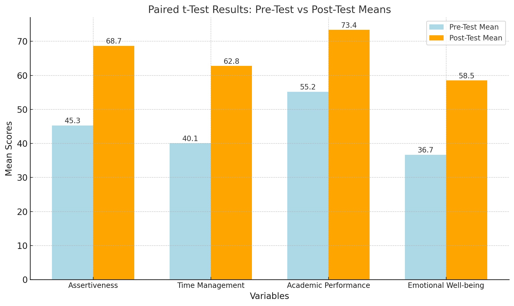 Academic performance improved significantly (Pre-Test Mean = 55.2, Post-Test Mean = 73.4). The analysis (t = 9.40, p < 0.001) highlighted the impact of assertiveness and discipline skills training in enhancing students’ ability to focus and achieve better academic outcomes. This improvement may stem from enhanced self-confidence and effective time management. The observed improvement in academic performance is consistent with the findings of Okoro and Adeyemo (2021), who reported that discipline and structured training positively affect academic outcomes. Training programs that combine assertiveness and discipline skills help students remain focused and motivated despite external pressures.