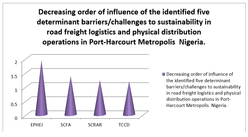Figure 1: Decreasing order of influence of the identified five determinant barriers/challenges to sustainability in road freight logistics and physical distribution operations in Port-Harcourt Metropolis Nigeria. Source: Prepared by the author