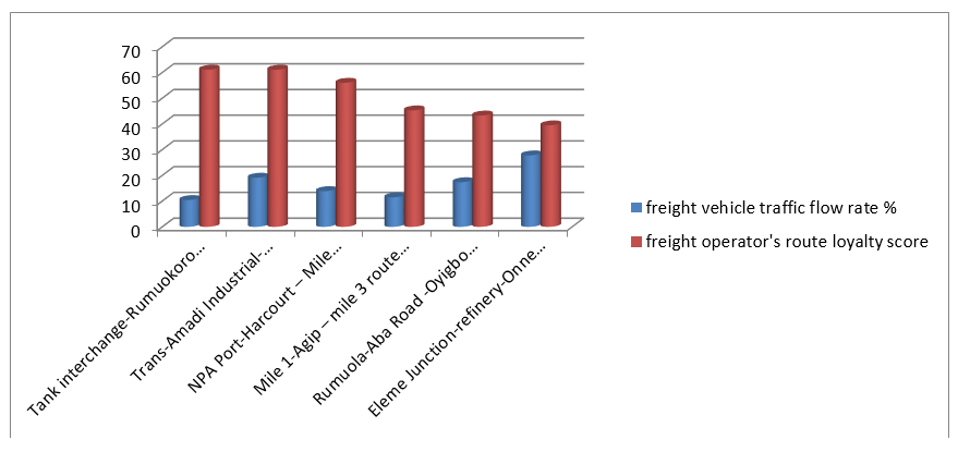 The distribution of the freight vehicle traffic flow rate across the freight corridors in Port-Harcourt and the route loyalty scores tend to show that freight corridors such as Eleme Junction-refinery-Onne route Rumuola-Aba road-Oyigbo routes which have higher freight vehicle traffic flow rates have less route loyalty scores while corridors such as tank-interchange-rumuokoro and Mile1-Agip-Mile3 routes with lower freight vehicle traffic flow rates have higher route loyalty scores.