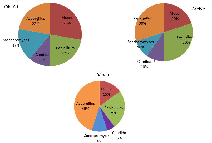In AGBA, Mucor had a positive occurrence with a frequency of 4 and a percentage frequency of 20%. Penicillium had a higher frequency of 6 and a percentage frequency of 30%. Candida and Saccharomyces had lower frequencies but still displayed positive occurrences. Aspergillus had a frequency of 6 and a percentage frequency of 30%. In Ododa, Mucor had a positive occurrence with frequency of 3 and a percentage frequency of 15%. Penicillium had a frequency of 5 and a percentage frequency of 25%. Candida, Saccharomyces, and Aspergillus had lower frequencies but still showed positive occurrences. Aspergillus had the highest frequency of 9 and the highest percentage frequency of 45%.