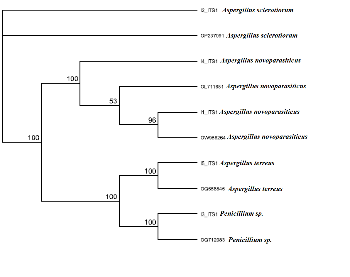 Upon conducting a mega blast search in the NCBI non-redundant nucleotide (nr/nt) database, the ITS sequences derived from the isolates showed exact matches with sequences that were significantly similar. When compared to ITS sequences from other species, the isolates’ sequences showed an absolute similarity rate of 100%. The isolates’ ITS sequences revealed where they were phylogenetic among a variety of fungal species, and these matches with the evolutionary distances determined by the Jukes-Cantor method, encompassing Mucor sp., Penicillium sp., Candida sp., Saccharomyces sp., and Aspergillus sp. Additionally, the analysis revealed close irelatedness ito Aspergillus sclerotiorum, Aspergillus novoparasiticus, Aspergillus terreus, and Penicillium isp. (Fig. 4.3).