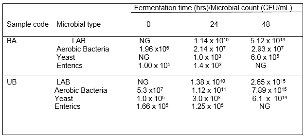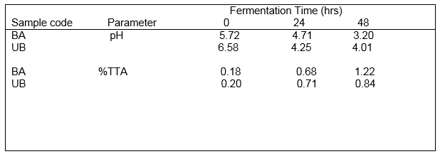 The result of the chemical analysis in Table 2 shows that the pH of all the fermented samples decreased as the fermentation time increased. The least pH (3.20) was observed at 48 hours in sample BA while the highest pH (6.58) was observed at 0 hour in sample UB. The titratable acidity increased as the fermentation time increased. Sample BA has the highest lactic acid content of 1.22% after 48 hours while Sample BA had the least lactic acid content of 0.18% after 0 hours.