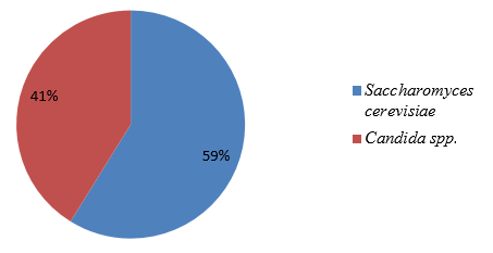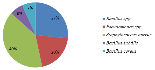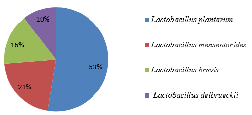 The organisms isolated within the period of fermentation were probably identified based on biochemical characteristics and sugar fermentation ability of all the isolates. Fig 2a, Fig 2b and 2c shows the distribution of Lactic Acid Bacteria (LAB), aerobic bacteria and yeast respectively during fermentation of the samples. L. plantarum had the highest percentage (53%) of occurrence and L. delbrueckii had the least percentage (10%) of occurrence of LAB isolates as shown in Fig 2a. From the aerobic bacteria Staphylococcus aureus had the highest percentage (40%) occurrence, followed by Bacillus spp. with (27%) and the least percentage occurrence was recorded in Bacillus subtilis with (6%) as shown in fig 2b. Saccharomyces cerevisiae had the highest percentage (67%) of occurrence while Candida spp. had the least percentage (33%) occurrence of the yeast isolates as shown in fig 2c.