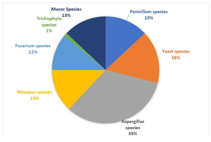 The seven species that were found were noted in different levels of occurrence. Aspergillus spp. (33%), Rhizopus spp. (13%), Fusarium spp. (11%), Trichophyte spp. (1%), Penicillium spp. (13%), and Yeast spp. (16%), in that order. As a result, Aspergillus species (33%) had the highest percentage occurrence and Trichophyte species (1%) recorded the lowest percentage of the occurrence. A variety of factors can explain the combined frequency of Aspergillus species.