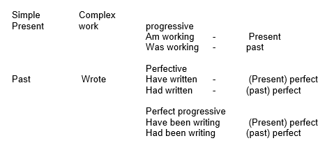 Aspect is another important feature of the verb in English. Aspect indicates whether the action expressed by the verb is continuous or still in progress (progressive) or whether it has been completed (perfective). Basically, therefore, there are two aspects in English: the progressive and the perfective aspects. We will illustrate them.