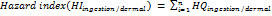 where, HIingestion/dermal is potential hazard through ingestion and dermal absorption of heavy metals, HQingestion/dermal is the hazard quotient through ingestion or dermal absorption, i is the pathways of exposure; n is the kinds of trace elements; HI>1 means an unacceptable risk and HI<1 means an acceptable level of risk of non-carcinogenic effects on health . Lim et al 2008.