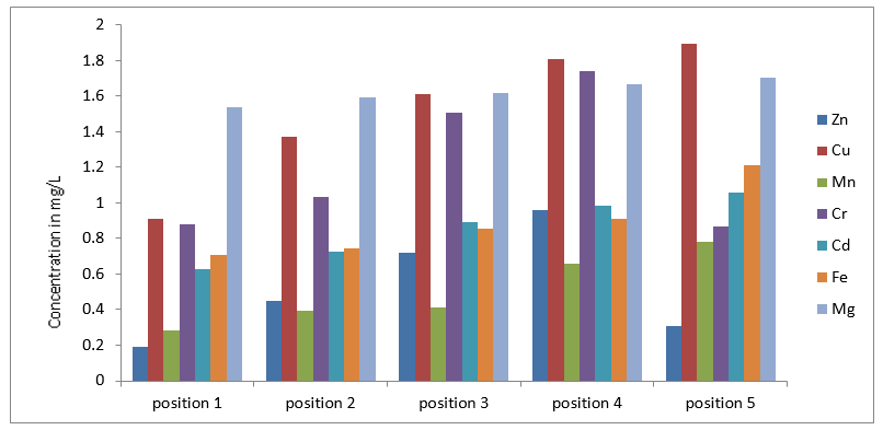 Fig. 3.1 Level of Concentration of Elements (Zn, Cu, Mn, Cr, Cd, Fe, Mg) in Water at Positions 1 – 5.
