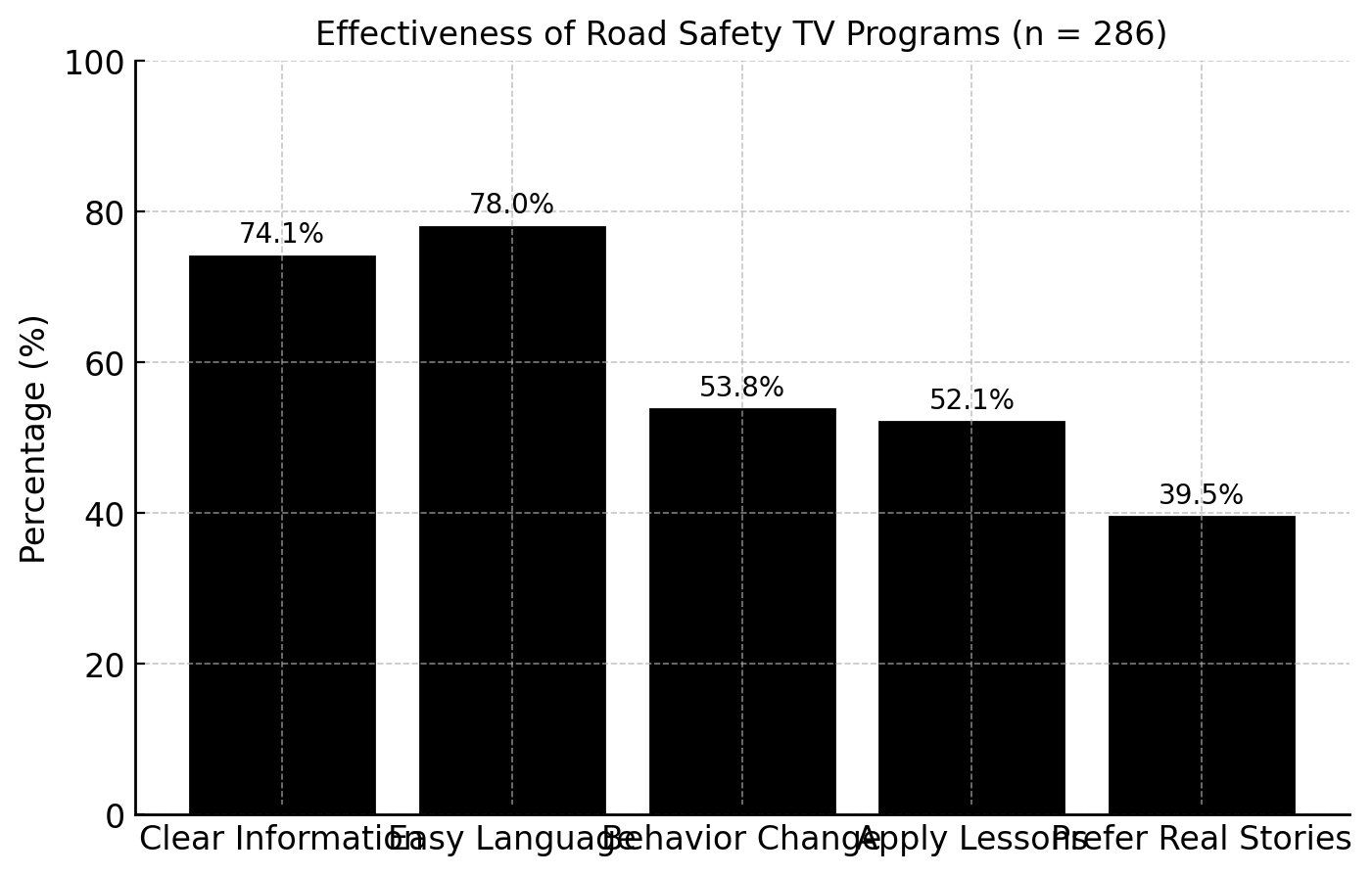 This section analyses how effective the educational content from the two TV programs is in influencing safe riding behaviors and awareness among Boda Boda riders. The analysis is based on valid responses from n = 286.