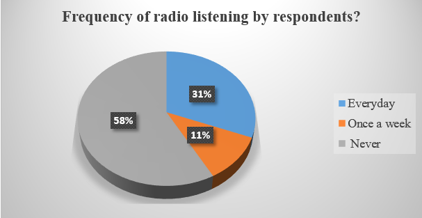 Figure 1: shows that 37 respondents (58%) reported that they never listened to the radio, 7 respondents (11%) indicated that they listened to the community radio only once a week, while 20 respondents (31%) reported listening to the station every day. This suggests that only a small proportion of listeners follow the educational programmes regularly, while the majority do not engage with the station frequently enough to benefit from its content.