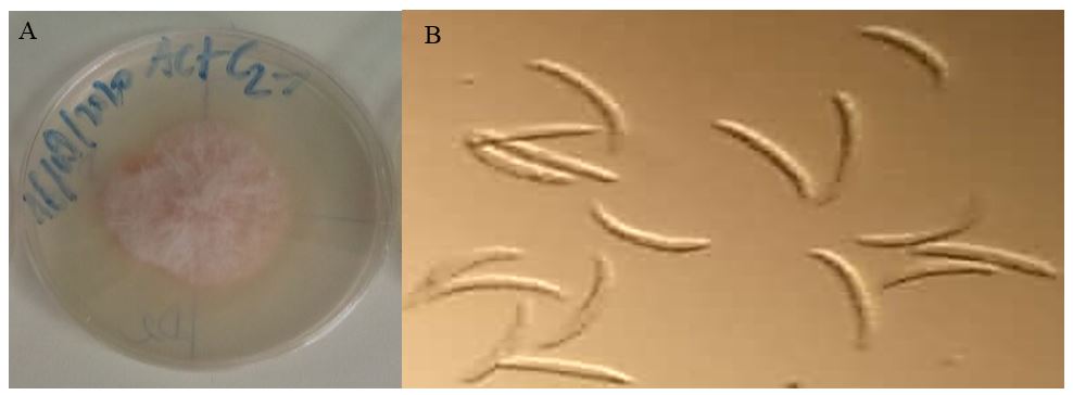 Two isolates were obtained using infected cowpea pods on PDA medium. Morphological characterization was used to identify fungus. Macroscopic observation showed white to grey mycelium colonies, sparse and aerial (Fig. 1A). Microscopic observation of the isolates showed falcate conidia (Fig. 1B). These morphological characteristics of the isolates belong to Colletotrichum capsici. Two of the five isolates that rapidly filled the Petri dishes (5 days after incubation) were used for the in vitro test.