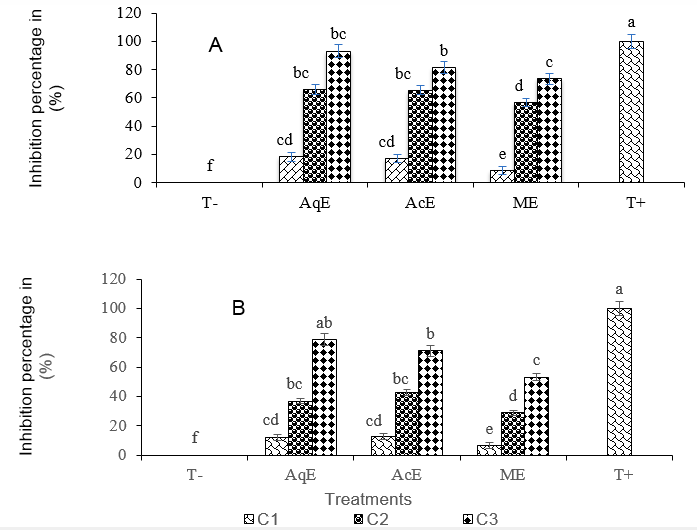 Fig. 3. Inhibition percentage of mycelial growth in A: CAK01 and B: CAK05 isolates of C. capsici; where (T-): Negative control; (C1): 12.5 μLmL-1; (C2): 25 μL. mL-1; (C3): 50 μL.mL-1; (T+): Positive control ; AcE: Extracted with Acetone; MeE: Extracted with Methanol; AqE: Aqueous Extract. The histograms surmounted by the same letters are not significantly different at the 5 % level.