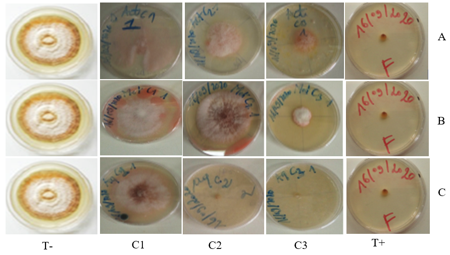 Fig. 4. In vitro inhibitory activity of aqueous and organic extracts of B. eagyptiaca seeds on the mycelial growth of CAK01 isolate after 6 days of incubation on PDA medium. (T-): negative control; (C1): 12.5 µL.mL-1; (C2): 25 µL.mL-1; (C3): 50 µL.mL-1and (T+) : 3.33 g.L-1 of fungicide; A= Acetone extract; B = Methanol extract; C = aqueous extract