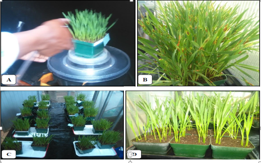 Figure 2: Schematic overview of the protocols for inoculation of spores on McNair to lines evaluation in the greenhouse at AARC; A. Inoculation of field collected spores on McNair for multiplication, B. Development of wheat stem rust on McNair after 14 days, C. Development of a single pustule on McNair and D. Inoculated a single pustule on differentials